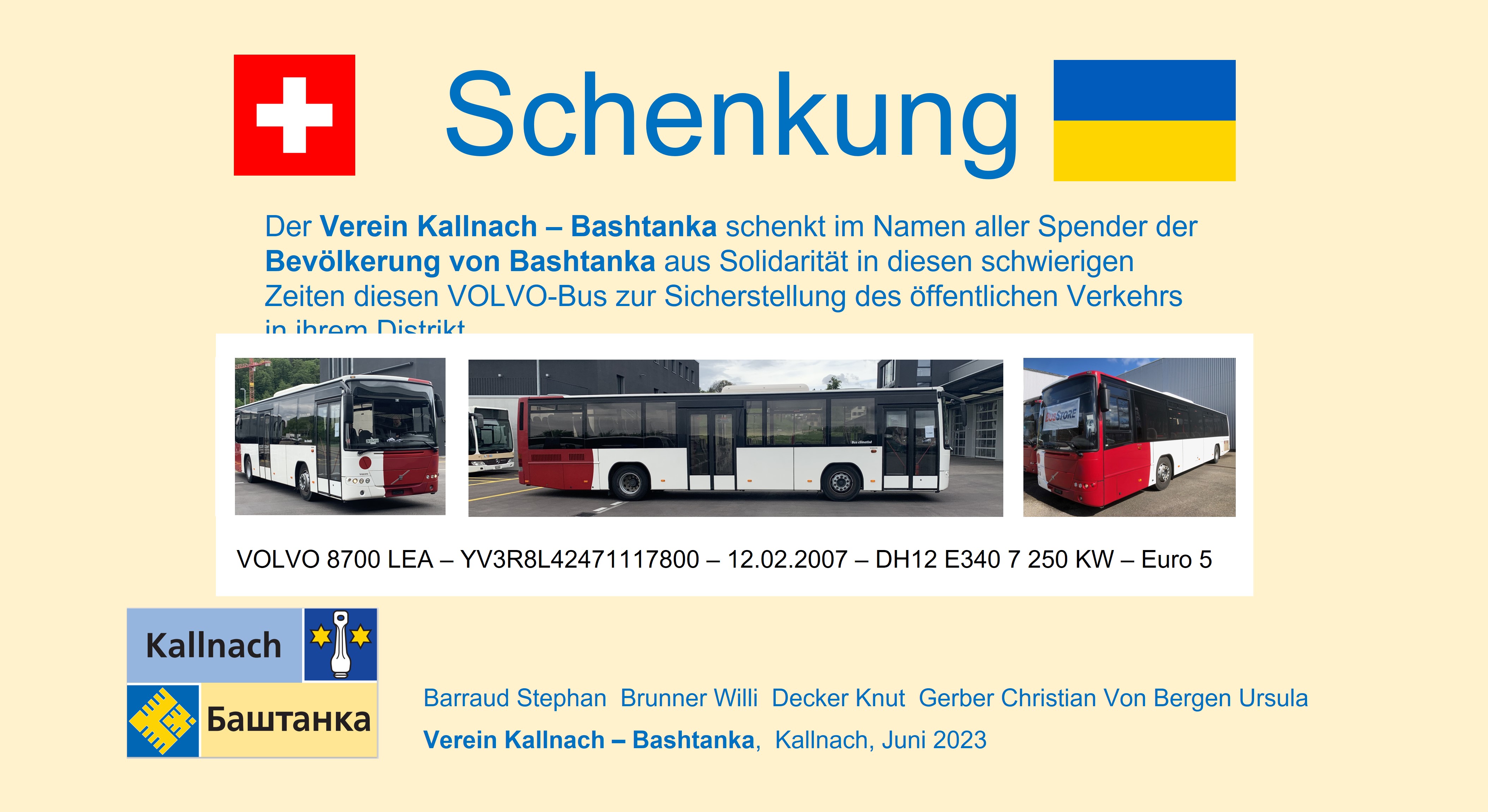 Bashtanka hat zu Beginn des Krieges seine öffentliche Transportmittel verloren. Seit da sind die 12 umliegenden Dörfer des Distrikthauptortes ohne Verbindung zu Spital, Verwaltung, Schulen und Einkaufsmöglichkeiten. Aufgrund der Notlage und auch als Zeichen der Solidarität wurde die Beschaffung eines Busses geprüft. Ein geeigneter Bus ist bei BusStore /Mercedes-Benz in Winterthur gefunden worden. Es ist ein VOLVO 8700 LEA Jahrgang 2007 /865'000 km der Freiburgischen Verkehrsbetriebe. Nach eingehender Prüfung durch einen VOLVO Spezialisten und dessen OK wurde der Bus auf Vorschuss gekauft. Die Gesamtkosten inklusive Überführungskosten betragen rund 12'000 CHF.